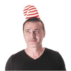 Heldere rode hoofdband met witte strepen.