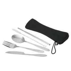 Set van 5-delige bestekset van roestvrij staal. Bevat: mes, vork, lepel, rietje en rietjesborstel.